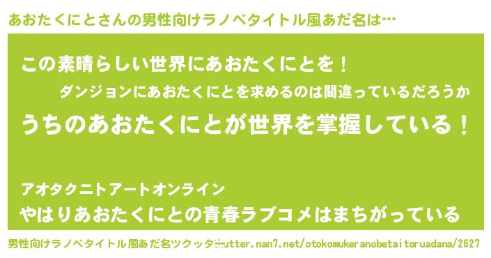 | 胡散臭い通販商品みたいなあだ名 | 『あなたにだけ特別に提供する100年もののヴィンテージワイン…その名も「あおたくにと」』 |