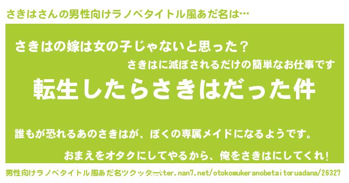 | 女子向けラノベタイトル風あだ名 | 『さきはの玉の輿計画!』 |