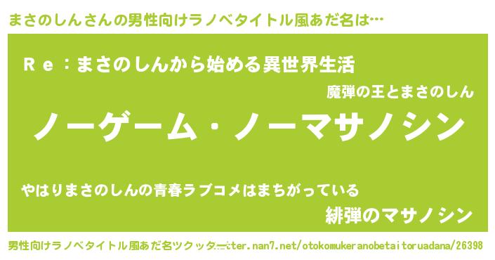 | 女子向けラノベタイトル風あだ名 | 『死神まさのしんの再婚』 |