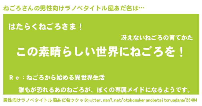 | 女子向けラノベタイトル風あだ名 | 『乙女ゲームの破滅フラグしかない悪役ねごろに転生してしまった…』 |