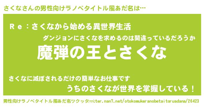 | 女子向けラノベタイトル風あだ名 | 『乙女ゲームの破滅フラグしかない悪役さくなに転生してしまった…』 |