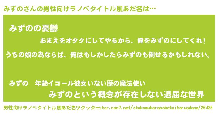 | ファンタジー風あだ名 | 『エターナルミズノー』『ミズフェル』 |