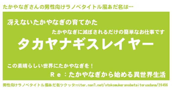 | 女子向けラノベタイトル風あだ名 | 『婚約破棄系悪役たかやなぎに転生したので、保身に走りました。』 |