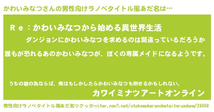 | 女子向けラノベタイトル風あだ名 | 『異世界でカフェかわいみなつを開店しました。』 |
