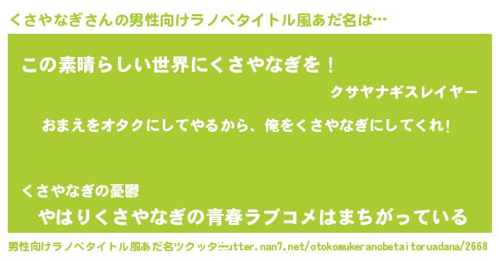 | 女子向けラノベタイトル風あだ名 | 『くさやなぎ夫妻のなれそめ』 |