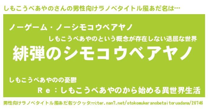 | 胡散臭い通販商品みたいなあだ名 | 『100人中100人が認めたイリジウム磁石…その名も「しもこうべあやの」』 |