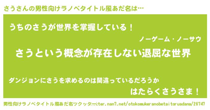 | 女子向けラノベタイトル風あだ名 | 『異世界で失敗しない100のさう』 |