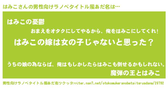 | 女子向けラノベタイトル風あだ名 | 『はみこ様がみてる』『はみこ伯爵の花嫁』 |