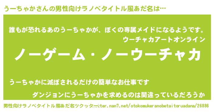| 女子向けラノベタイトル風あだ名 | 『死神うーちゃかの再婚』 |