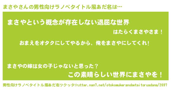 | 女子向けラノベタイトル風あだ名 | 『まさや夫妻のなれそめ』 |