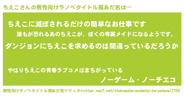| 女子向けラノベタイトル風あだ名 | 『ちえこの卵を拾いまして』 |