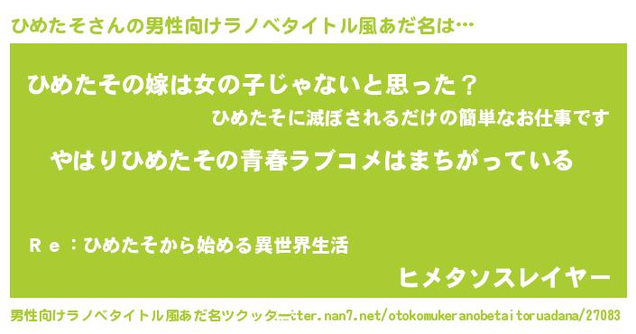 | 女子向けラノベタイトル風あだ名 | 『ひめたそ伯爵の花嫁』『闇のひめたそ』 |