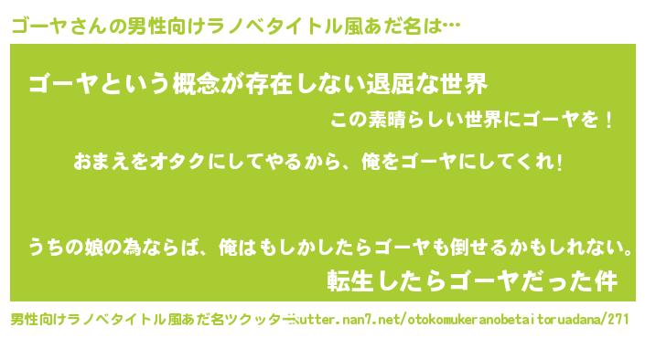 | ヘコむあだ名 | 『ゴーヤ(笑)』『牛乳』『ゴーもー』 |