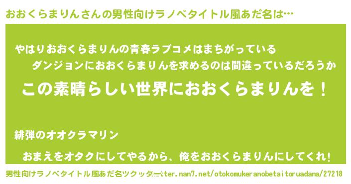 | 胡散臭い通販商品みたいなあだ名 | 『あなたにだけ特別に提供する限定10本のレアな日本酒…その名も「おおくらまりん」』 |