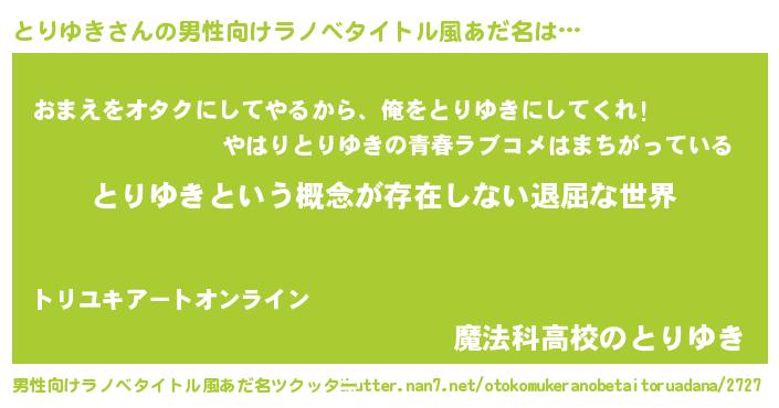| 胡散臭い通販商品みたいなあだ名 | 『絶対に幸福をもたらす水素水…その名も「とりゆき」』 |