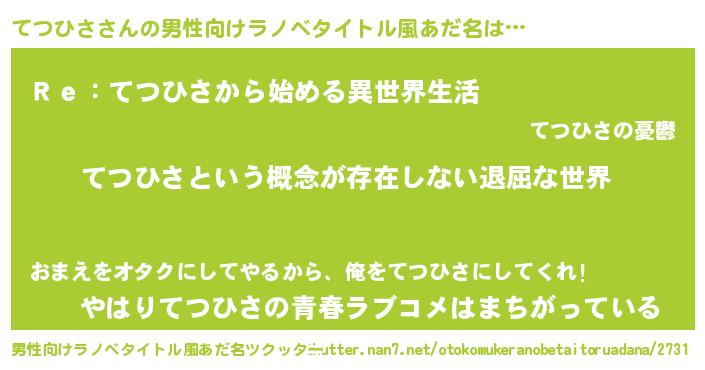 | 女子向けラノベタイトル風あだ名 | 『異世界で失敗しない100のてつひさ』 |