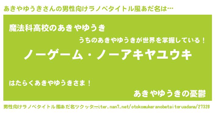 | 女子向けラノベタイトル風あだ名 | 『死神あきやゆうきの再婚』 |