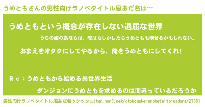 | 女子向けラノベタイトル風あだ名 | 『うめとも夫妻のなれそめ』 |