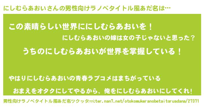 | 胡散臭い通販商品みたいなあだ名 | 『あなたにだけ特別に提供する100年もののヴィンテージワイン…その名も「にしむらあおい」』 |