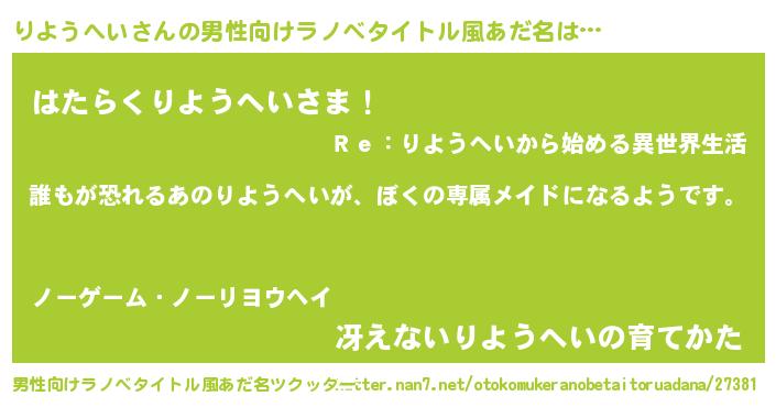 | 女子向けラノベタイトル風あだ名 | 『異世界でカフェりようへいを開店しました。』 |