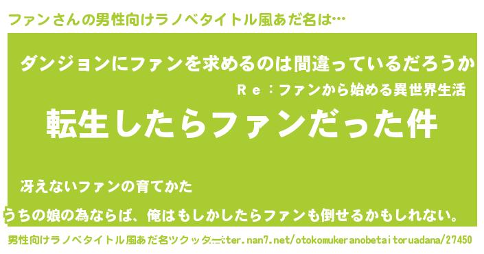 | 女子向けラノベタイトル風あだ名 | 『ファンの玉の輿計画!』『闇のファン』 |