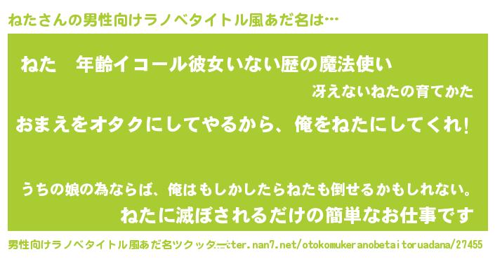 | 女子向けラノベタイトル風あだ名 | 『ねた夫妻のなれそめ』『ねた伯爵の花嫁』 |