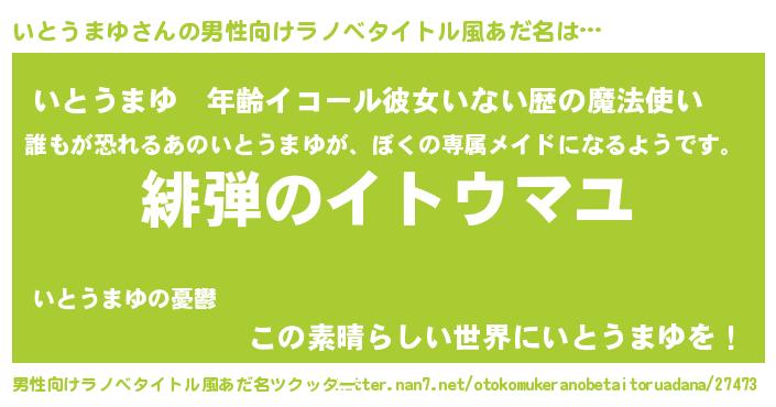 | 女子向けラノベタイトル風あだ名 | 『シンデレラいとうまゆ家の靴箱館』 |
