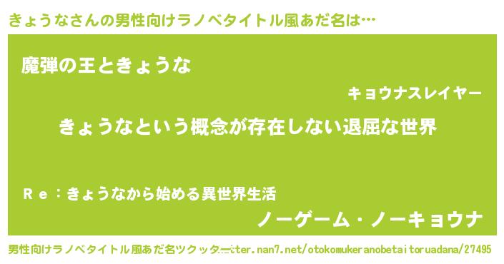 | 女子向けラノベタイトル風あだ名 | 『異世界で失敗しない100のきょうな』 |
