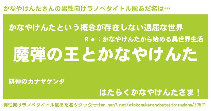 | 女子向けラノベタイトル風あだ名 | 『乙女ゲームの破滅フラグしかない悪役かなやけんたに転生してしまった…』 |