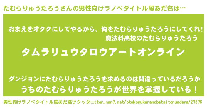 | 女子向けラノベタイトル風あだ名 | 『たむらりゅうたろう姫と円卓の騎士』 |
