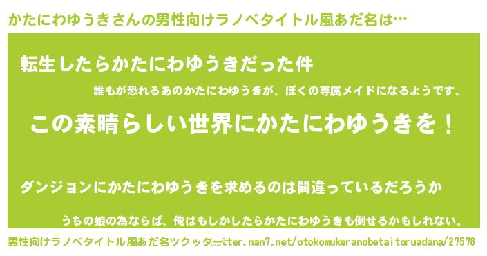 | 女子向けラノベタイトル風あだ名 | 『悪役かたにわゆうきに転生したようですが、知った事ではありません』 |