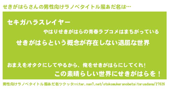 | 胡散臭い通販商品みたいなあだ名 | 『絶対に幸福をもたらす健康食品…その名も「せきがはら」』 |