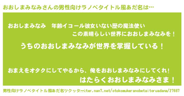 | 胡散臭い通販商品みたいなあだ名 | 『あなたにだけ特別に提供する100年もののヴィンテージワイン…その名も「おおしまみなみ」』 |