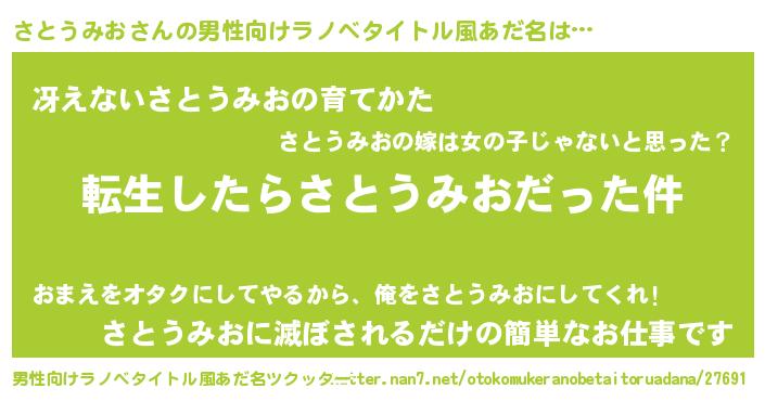 | 女子向けラノベタイトル風あだ名 | 『婚約破棄系悪役さとうみおに転生したので、保身に走りました。』 |