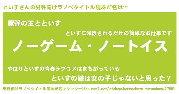 | 女子向けラノベタイトル風あだ名 | 『死神といすの再婚』『といす様がみてる』 |