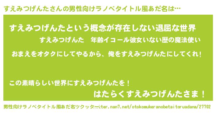 | 女子向けラノベタイトル風あだ名 | 『すえみつげんた夫妻のなれそめ』 |