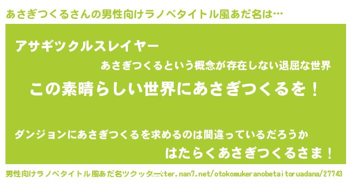 | 女子向けラノベタイトル風あだ名 | 『乙女ゲームの破滅フラグしかない悪役あさぎつくるに転生してしまった…』 |