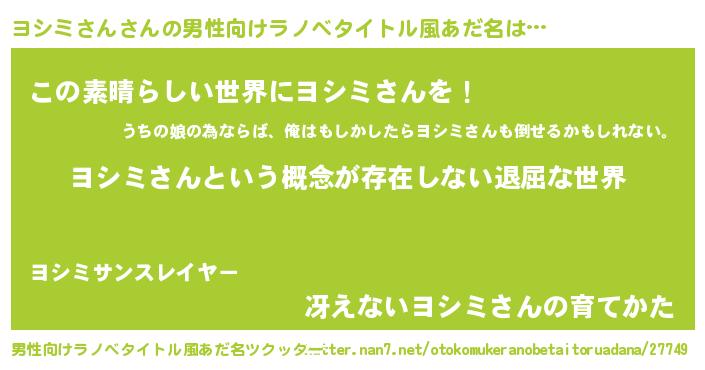 | 女子向けラノベタイトル風あだ名 | 『異世界で失敗しない100のヨシミさん』 |