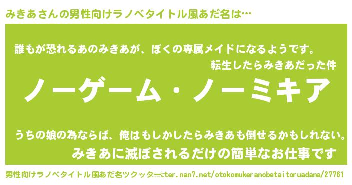 | 女子向けラノベタイトル風あだ名 | 『死神みきあの再婚』『みきあの契約王妃』 |