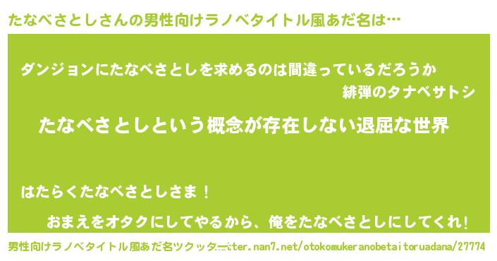 | 女子向けラノベタイトル風あだ名 | 『異世界で失敗しない100のたなべさとし』 |
