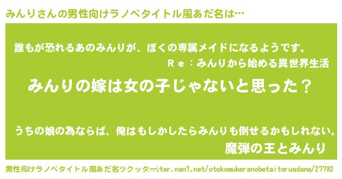 | 女子向けラノベタイトル風あだ名 | 『みんり様がみてる』『みんりの契約王妃』 |