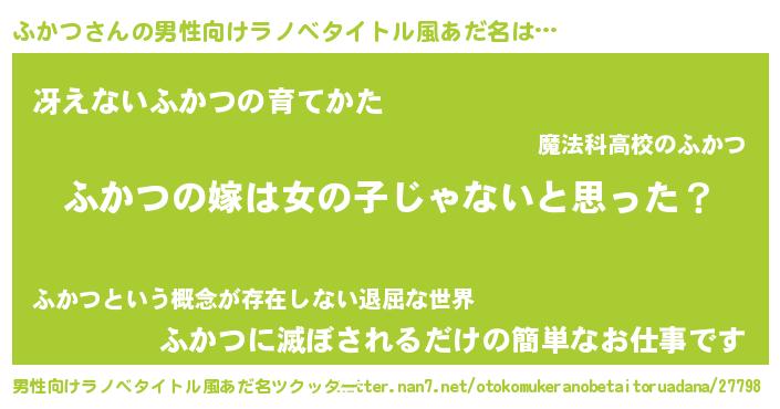 | 女子向けラノベタイトル風あだ名 | 『ふかつ様がみてる』『ふかつの契約王妃』 |