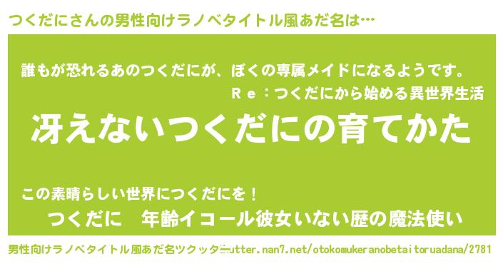 | 胡散臭い通販商品みたいなあだ名 | 『来世でも幸せになれる水素水…その名も「つくだに」』 |