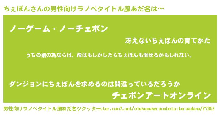 | 女子向けラノベタイトル風あだ名 | 『ちぇぼん伯爵の花嫁』『ちぇぼん恋絵巻』 |