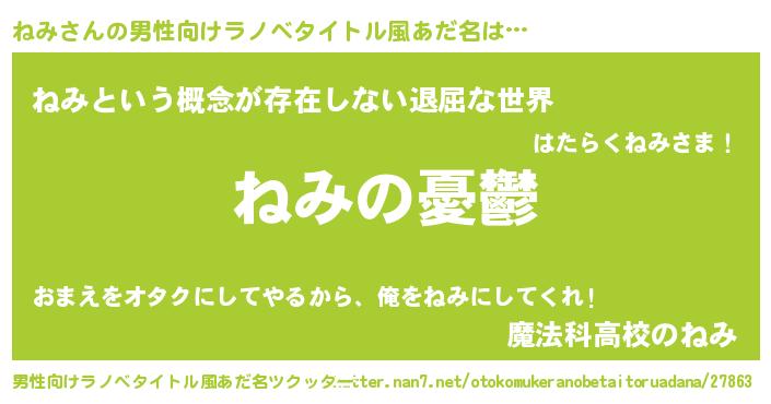 | 女子向けラノベタイトル風あだ名 | 『(仮)ねみのやんごとなき事情』 |