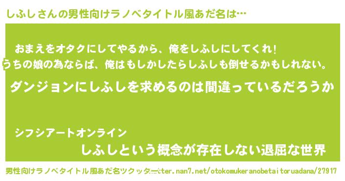| 女子向けラノベタイトル風あだ名 | 『しふしの卵を拾いまして』 |