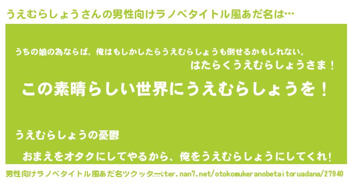 | 女子向けラノベタイトル風あだ名 | 『乙女ゲームの破滅フラグしかない悪役うえむらしょうに転生してしまった…』 |