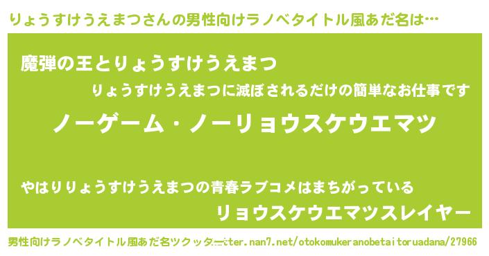 | 女子向けラノベタイトル風あだ名 | 『死神りょうすけうえまつの再婚』 |