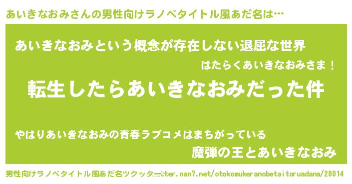| 女子向けラノベタイトル風あだ名 | 『あいきなおみの玉の輿計画!』 |