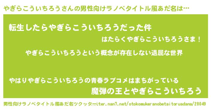 | 女子向けラノベタイトル風あだ名 | 『異世界で失敗しない100のやぎらこういちろう』 |